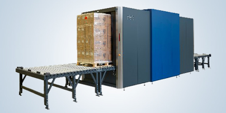 Dual-view X-ray system for palletized goods with tunnel size 145 x 180 cm. Supports inspection of large consolidated cargo up to 1,000 kg/m or 5,000 kg evenly distributed.